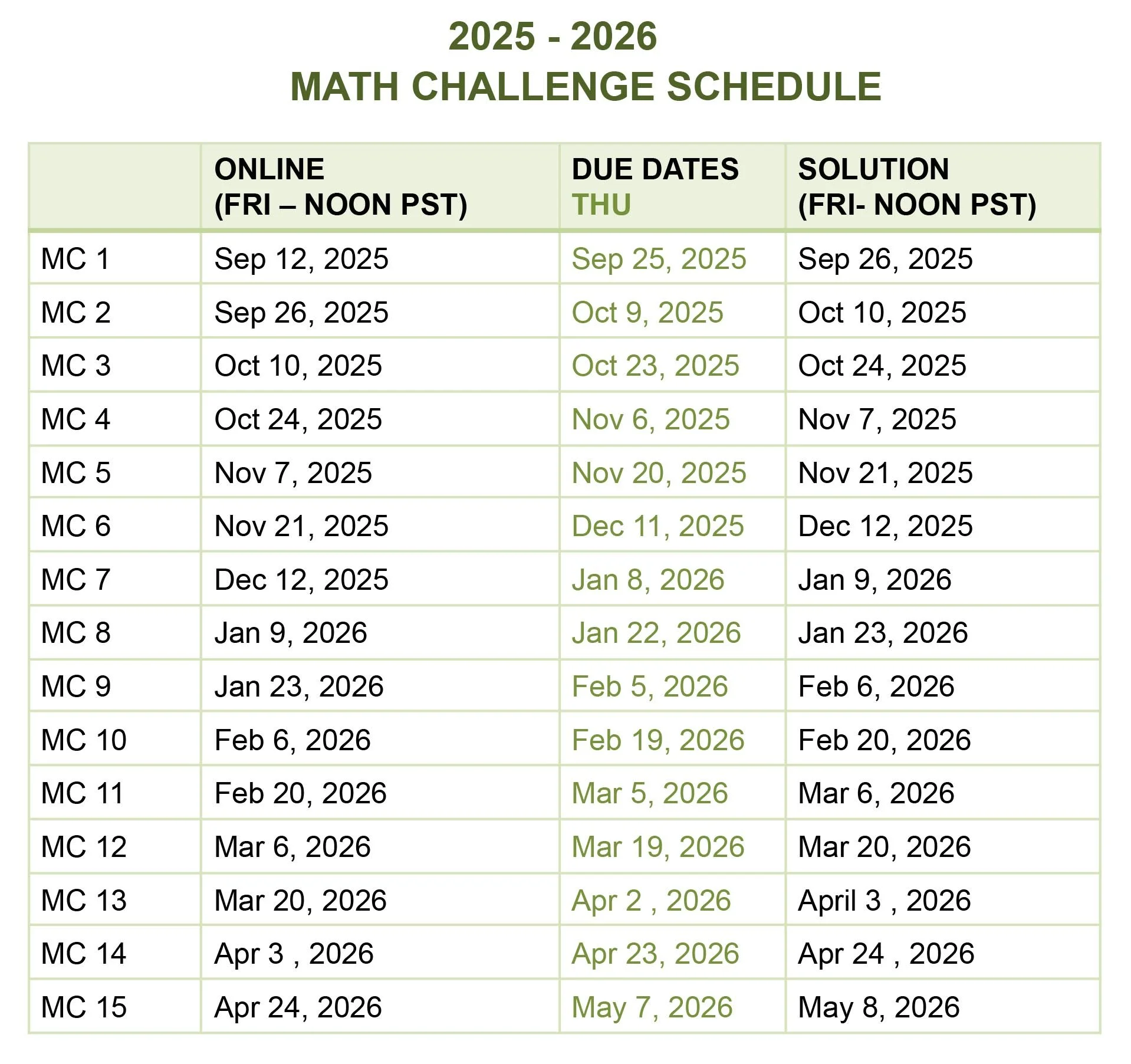Check the Math Challenge Schedule for release dates, solutions, and deadlines.