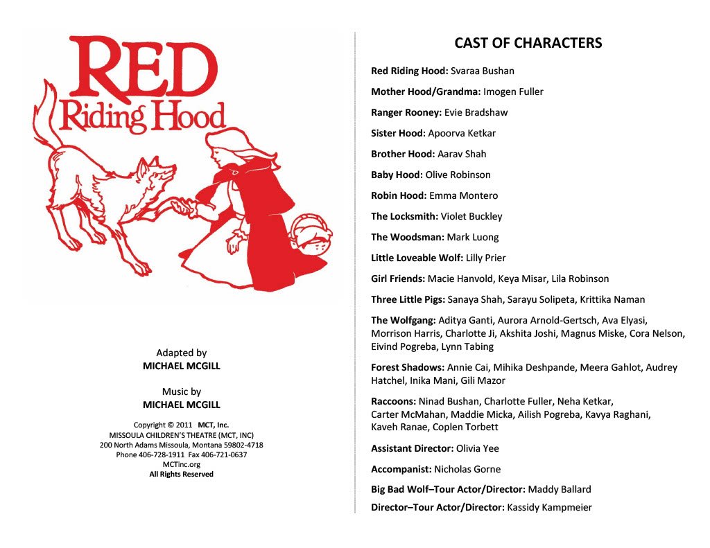 Over the river and through the woods to Grandmother’s house she goes. Red Riding Hood, not so little anymore, and her pre-teen pals try to stay on the straight and narrow in the latest adventure from the Missoula Children's Theatre, RED RIDING HOOD. The Big Bad Wolf, who is not so bad after all, and a friendly neighborhood Forest Ranger urge our heroes to stay true to the path, for in the Shadows lurk diversions and a sinister surprise or two. A pack of woefully nasty young wolves and a handsome Woodsman, too good to be true, are a must for our story. And we can’t have a wolf tale without Three Little Pigs and even a Boy Who Cries…you guessed it. With help from her family and a loyal young Locksmith (he carries the key), Red finds her Grandma and a whole lot more. Now if only she could retrieve her picnic basket from those rascally Raccoons. Life is no picnic when you stray from the trail!