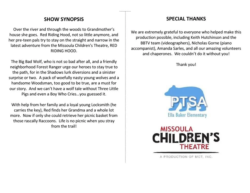 Ella Baker and Missoula Children’s Theatre proudly present Red Riding Hood! The show will be Saturday March 28th in the Ella Baker Commons. There are two performances: 3PM and 5:30 PM. Tickets are $10. Come see the show and support our Ella Baker student actors!